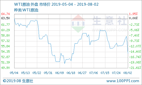 8月1日,受中美貿(mào)易戰(zhàn)談判再度陷入僵局以及美聯(lián)儲降息提振美元走強(qiáng)影響,美國WTI原油期貨市場價格暴跌,報53.95美元/桶,跌幅為4.63美元,布倫特原油期貨價格暴跌,報60.50美元/桶,跌幅為4.55美元。美國原油期貨重挫7%,創(chuàng)6周以來的最低收盤價。布倫特原油期貨價格下跌超過6%,創(chuàng)七周以來最低收盤價,同時創(chuàng)2016年2月以來的最大單日跌幅。