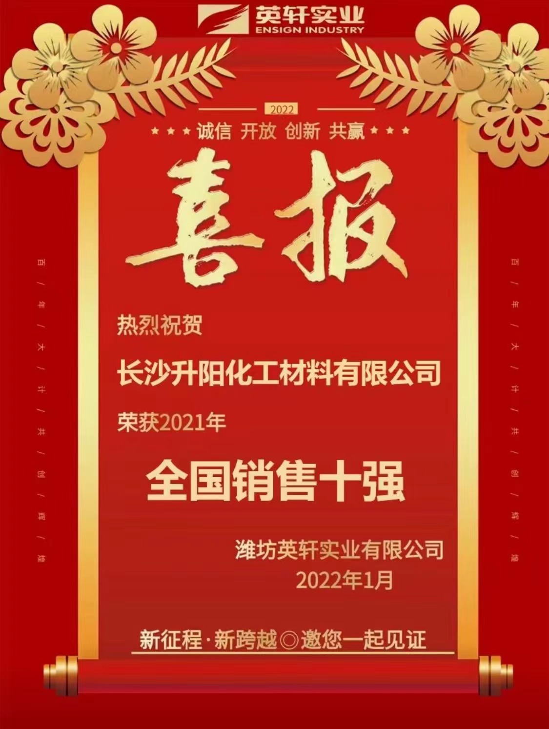 熱烈祝賀升陽化工榮獲英軒實(shí)業(yè)2022年“全國(guó)銷售十強(qiáng)”